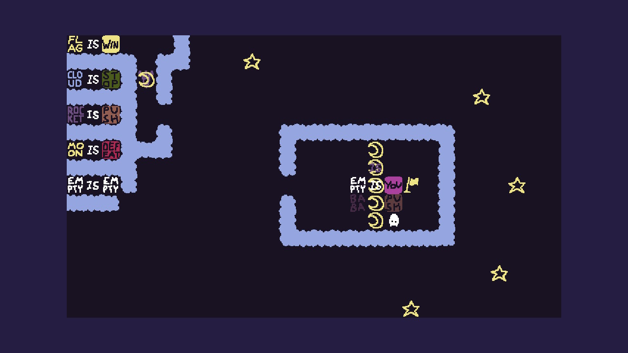EMPTY ISを雲(CLOUD)の中の中央の、BABA IS YOUの1つ上の行に移動させる。PUSHをISの1つ右、2つ下に置く。